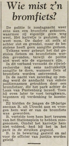 Een gestolen bromfiets is teruggevonden, de dader is opgepakt, maar van wie is het ding? Een oproep in het UN van 2 juli 1962, pagina 4.